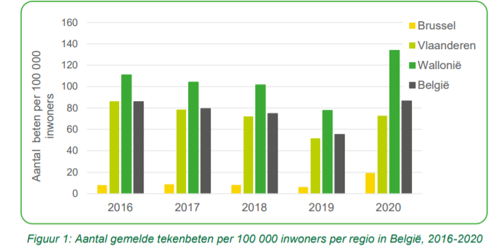 Het is ook belangrijk om in het achterhoofd te houden dat de gewaarwording, lees “de veranderingen in het aantal tekenbeten”, niet enkel een gevolg is van een toename of afname van het aantal teken. Als voorbeeld hiervan kunnen we het jaarlijks rapport van Sciensano nemen, dat ze sinds 2015 maken in het kader van TekenNet. In het laatste rapport wordt gesteld dat het hoge aantal tekenbeten in 2020, ten opzichte van 2019, wel eens te maken kan hebben met de wandellust die een groot deel van de Belgen overvalt in tijden van lockdown… Deze hypothese kan moeilijk hardgemaakt worden, maar is een aannemelijke verklaring voor de observatie.
