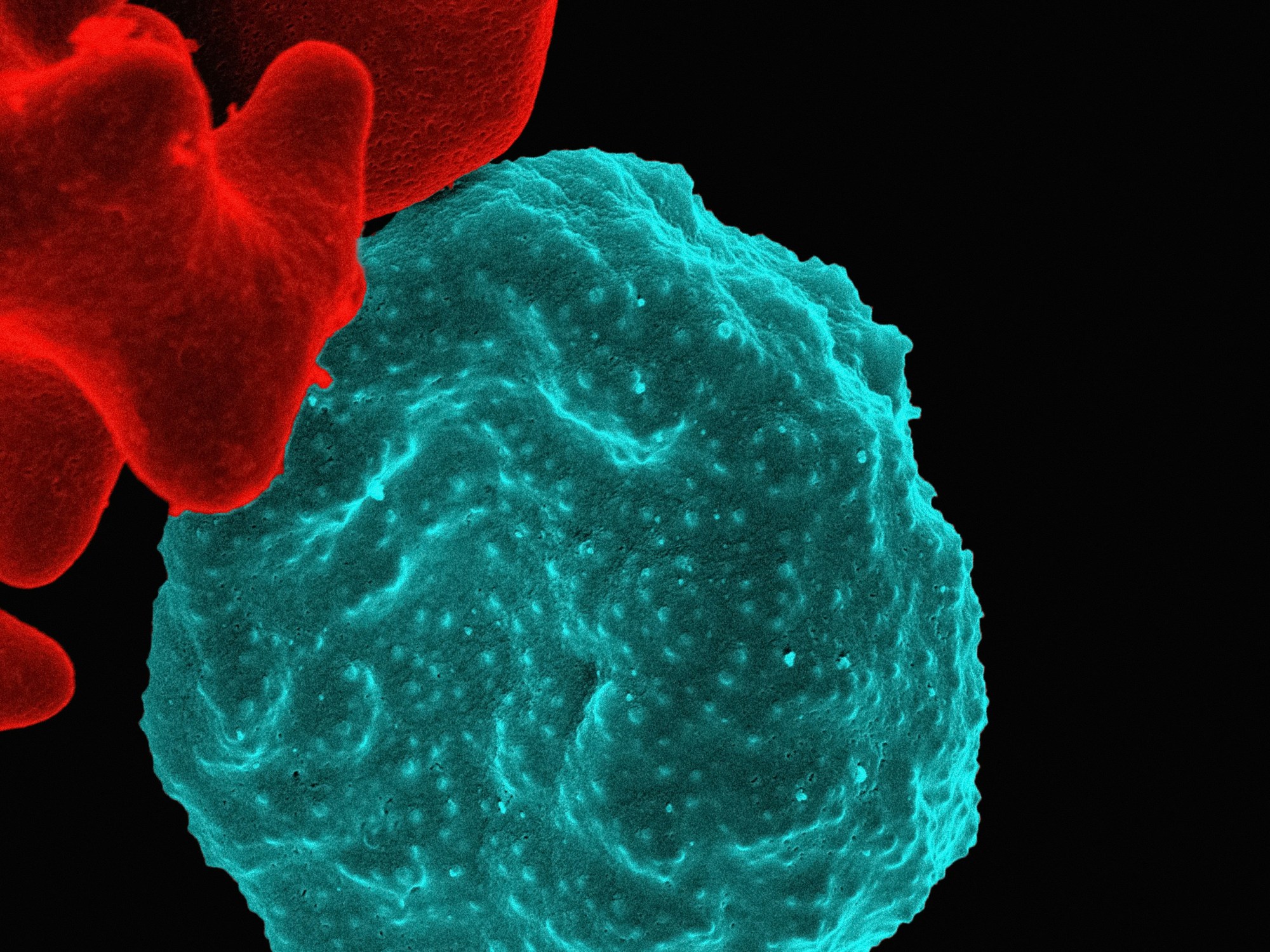 Scanning-elektronenmicrofoto van een rode bloedcel geïnfecteerd met malariaparasieten (blauwgroen). De kleine uitsteeksels op de geïnfecteerde cel laten zien hoe de parasiet zijn gastheercel aanpast door uitstulpingen te vormen, ‘knobbels’ genoemd, op het oppervlak. Niet-geïnfecteerde cellen (rood) hebben een gladder oppervlak. Foto: National Institute of Allergy and Infectious Diseases on Unsplash